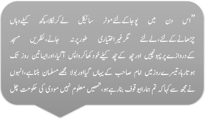 نہیں ہے،اس دن میں پوجاکےلئےموٹر سائیکل لےکرنکلا،کچھ کیلےوہاں چڑھانےکےلئے،لےلئے مگرغیراختیاری طورپرنہ جانے،نظریں مسجدکےدروازےپرپہونچیں اورچھ کےچھ کیلےخودکھاکرواپس آگیا،اورایساتین روز تک ہوتارہا،تیسرےروزمیں امام صاحب کےیہاں گیااوربولا مجھےمسلمان بنناہے،انہوں نےمجھ سےکہاکہ تم ہمارابیوقوف بنارہےہو،تمھیں معلوم نہیں مودی کی حکومت چل رہی ہے،جاؤ یہاں سےنکلو،دوسرےروزگیاپھرانہوں نےدھمکادیا،اورکہاکہ اگرتم یہاں آئےتوہم تھانےمیں رپورٹ کردیں گے،میں نے سنیل گوڑےسےکہاکہ آپ میری بات گلاب بھائی سےکرائیں ،گلاب بھائی نےکہاکہ یہ آپ پراللہ کی رحمت ہے،آپ گھبرکھرائیے نہیں ،آپ کواس سےکچھ نقصان نہیں ہوگا،تیسرےروزپھرمیں امام صاحب کےپاس گیا،کہ مجھےمسلمان بنناہے۔